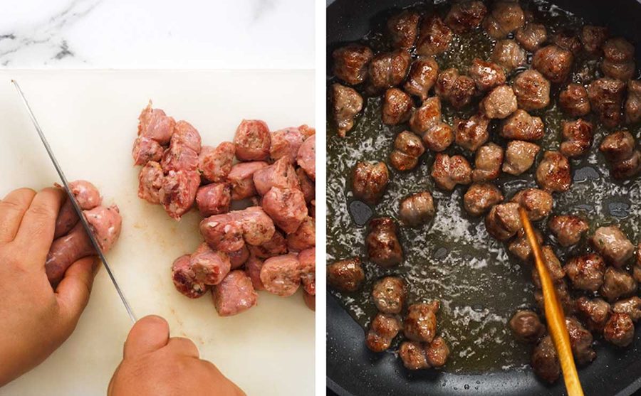 Cut the sausages into even size pieces so they are roughly as wide as they are long, so they will cook into balls rather than cylinders! So if your sausages are thin, you’ll have more smaller meatballs. Whereas if you have fat sausages, you’ll have larger but less meatballs.Both are food situations!