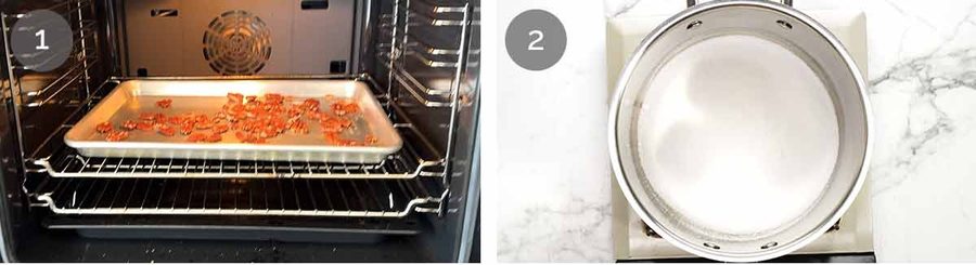 Toffee – Spread the sugar in a large saucepan over medium low heat. Leave it until you see the edges melting into a clear sugar syrup, then use a chopstick to stir every now and then to encourage the sugar to fully melt. Once it turns pale golden, remove from heat (it will go more golden in the next step).