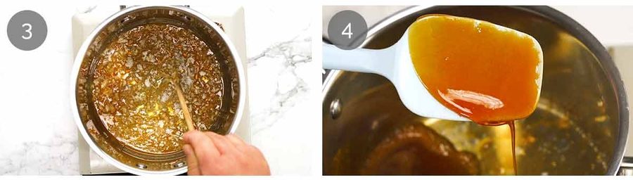 Toffee colour – Once fully melted, let it become a light amber colour then take it off the stove.