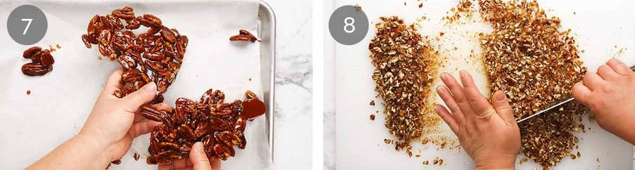 Cool and chop – Cool for an hour until the toffee hardens. Break into large chunks then use a knife to chop it into small pieces and toffee pecan dust (this is really nice!). Set aside until required.