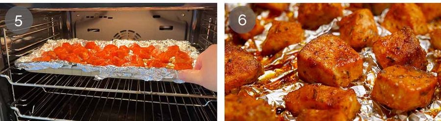 Wrinkle foil up by lightly scrunching it with your hands then unfold it without flattening the wrinkles and cover the tray. We want lots of little crinkly wrinkly little ridges, bumps and lumps all over the foil that will act as microscopic little “prongs” that keep the salmon elevated off the tray – this is what stops the underside from getting soggy which makes the Cajun spice sweat off. It also prevents the salmon from sticking to the tray.Nifty little Japanese fish cooking technique I picked up from my mother!