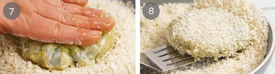 Flip using a spatula and press down to make the panko adhered. Reshape as needed – the edges might crack, your patty might not be a perfect circle when you squish it (gasp shock horror!)