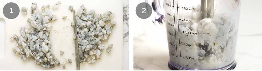 Thaw – If using frozen prawns, thaw thoroughly and discard excess water (you lose ~20% in weight in water), then chop into 8mm / 1/3″ pieces.