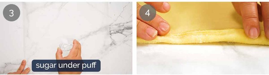 Fold edge – Place puff pastry on top of the sugar. Fold the edges inwards to create a 1cm / 0.4″ edge.