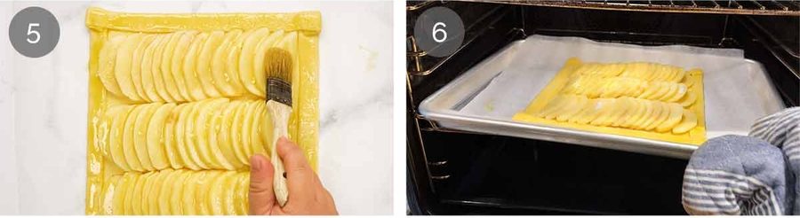 ABBREVIATED: Sprinkle paper with 3t sugar, put puff on, fold in 1cm / 0.4″ edge. Top with apple, brush butter, sprinkle 2t sugar. Bake on preheated tray at 210°C/375°F (190°C fan) for 30 minutes.