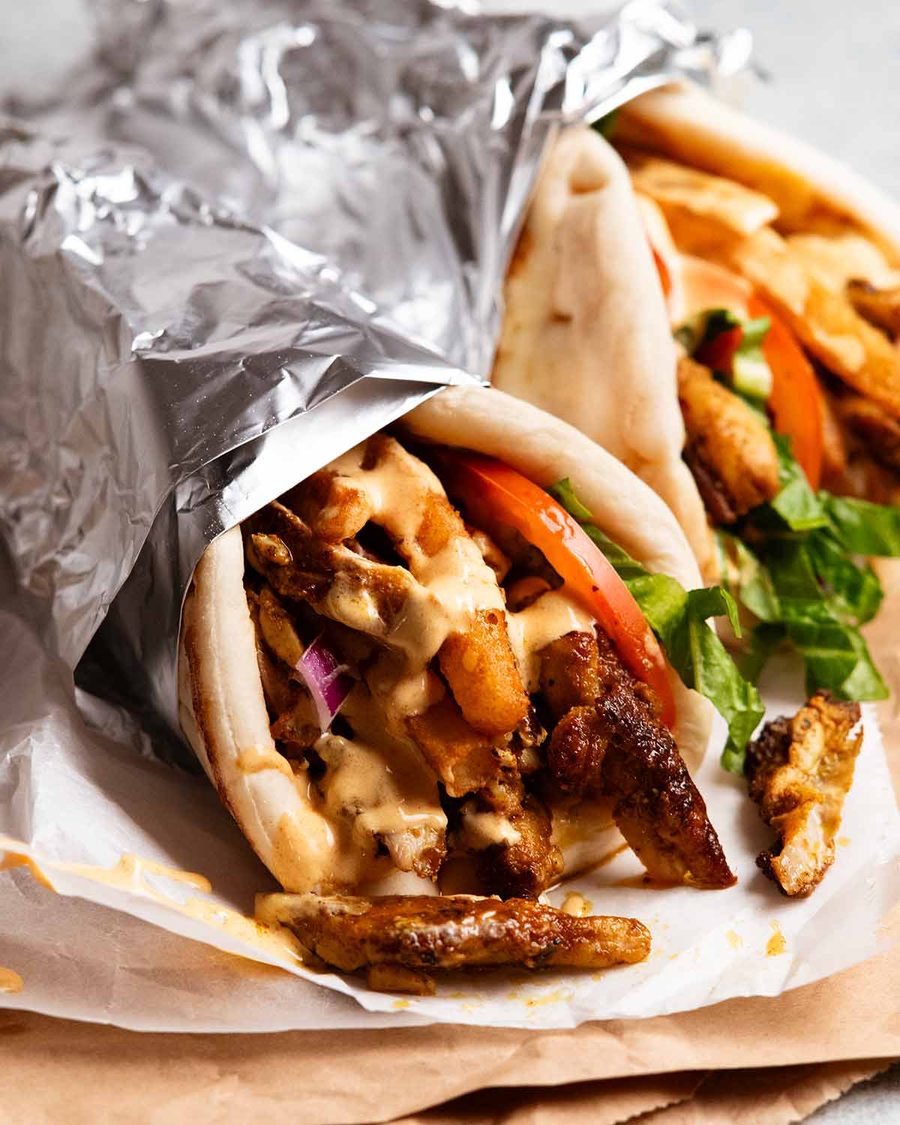 1. Chicken – If you have large thighs with parts thicker than 1cm/0.4″, I recommend butterflying to make them cook more evenly. Slice horizontally through the thicker sections to open them up so the pieces are roughly even in thickness. Breast works fine too, though thigh is my preference – juicier!2. Curry powder – the secret ingredient! Adds a touch of warmth and subtle layers of flavour, plus a warm golden colour. Use everyday curry powder from the grocery store (mild, not hot).3. Hot chips – Essential inclusion according to gyros purists! I use frozen thick-cut chips for convenience, though when I want to show off, I make fries from scratch using my crispy homemade fries recipe, but cutting the potatoes thicker.4. Pita bread – look for puffy bready type pita bread rather than thin flatbreads. They must be warmed before use or they will break when folded. If yours are slightly stale, sprinkle with water before warming. This will moisten and revive the bread.This recipe is slightly adapted from the recipe provided by Thomas Deliopoulos, owner of Kalimera Souvlaki Art and first appeared in Good Food Australia in an article I wrote. Nutrition per gyros, assuming 6 servings assuming 2/3 of the sauce is used and excluding hot chips (which, to be honest, I don’t use for everyday purposes).