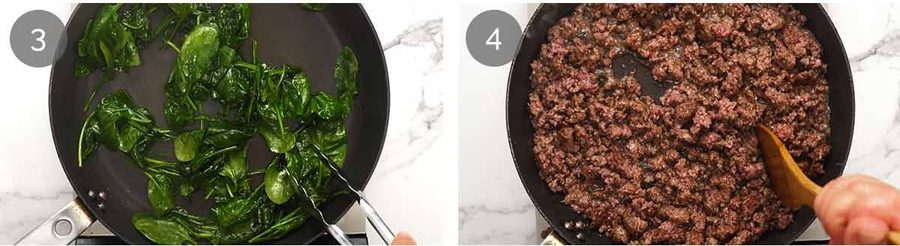 Wilt spinach – Heat the 2 teaspoons of oil in a large non-stick pan over high heat. Add half the spinach, toss with tongs until semi wilted (~30 sec), then add the rest. Toss until wilted (~ 1 minute) then remove into a bowl.