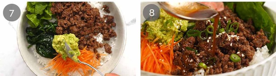 Assemble – Spoon beef over rice, place spinach and carrot. Top with pickled ginger and a dollop of mashed avocado. Tuck lettuce down the side. Sprinkle with sesame seeds and green onion. Serve with sauce for drizzling all over everything before jumbling it all up and digging in!