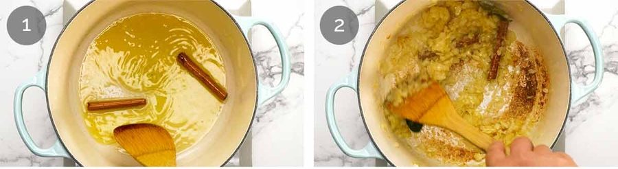 Toast cinnamon sticks – Melt the ghee (or butter) then toast the cinnamon sticks. This brings out the flavour and flavours the ghee too.