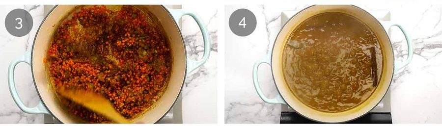 Spices and lentils – Add the Spices and stir for 30 seconds. Add the lentils and stir to coat in the spices.