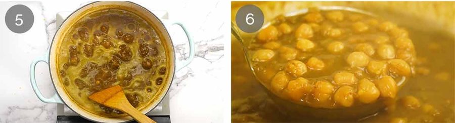 Simmer chickpeas – Add the chickpeas, water and baking soda. Increase the heat to make it simmer again. Then lower the stove slightly and leave to simmer gently for 30 minutes without a lid or until the lentils mostly broken down to make a thin gravy (you can cook an extra 10 minutes to thicken more if you want).