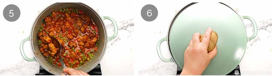 All in – Add rice and stir to coat in the tasty oil. Add remaining rice ingredients, then scatter the chicken evenly across the surface. Also add any juices accumulated in the bowl. Stir, bring to a simmer, then put the lid on and lower heat to medium low so it’s simmering gently. (Note 3)