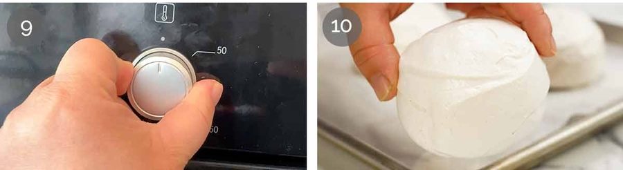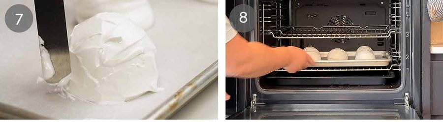Pipe mounds Transfer meringue mixture into a large piping bag. Snip the end to make a large 2cm / 0.8″ hold. Pipe 5 mounds on the tray, then smooth into domes that are taller than they are wide (they flatten slightly when baked). Mine are about 4 cm / 1.6″ wide and 6.5cm /2.6″ tall. Use a small offset spatula or butter knife to smooth into a dome shape (no need to be perfect, it gets decorated later).
