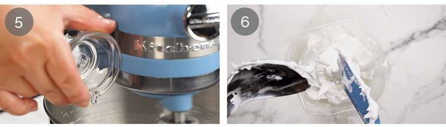 Beat 5 minutes – Continue to beat for 5 minutes on high until it’s fluffy, glossy, and there are no sugar grains remaining when you rub a bit between your fingers. Add vinegar and cornflour then beat for a further 30 seconds.