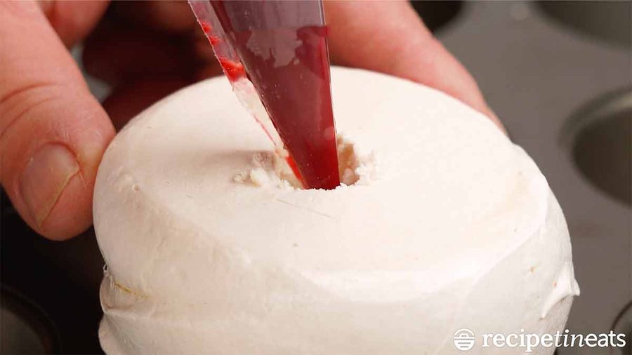 Access hole! Place a pavlova bomb upside down in a muffin tin, to hold in place as you work. Carefully cut a 1cm / 0.4″ hole in the middle using a small sharp knife. Stick a chopstick into the hole and squidge around GENTLY to move some pavlova marshmallow centre out of the way to make room for the fillings.