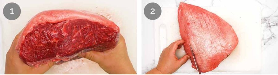 Silverskin – If your rump cap still has silver skin on it (the see-through skin on the underside that looks “silver”), cut it off as this can become tough. See diagram below with the silver skin area marked (be aware of sneaky silver skin hiding under fat!).
