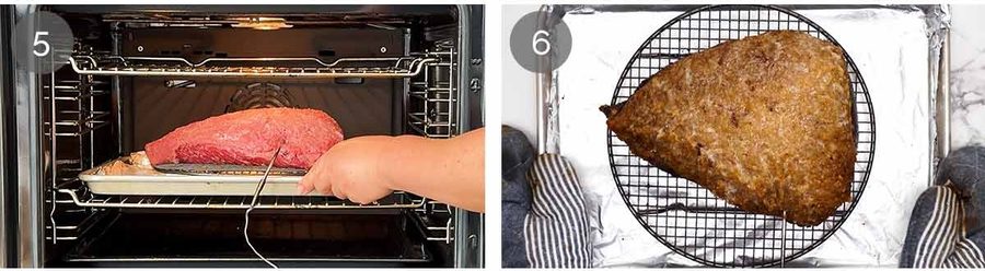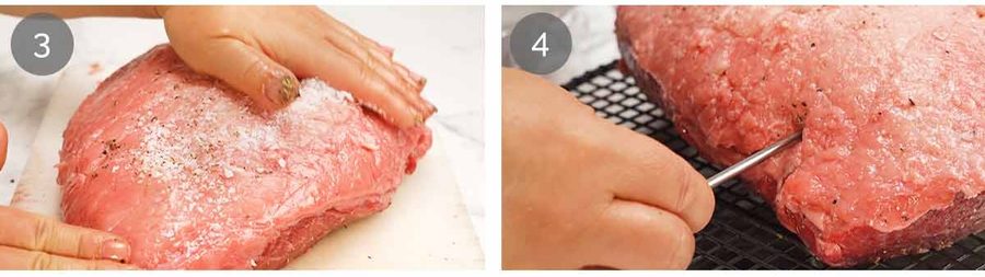 Meat thermometer – Place the beef on a rack set on a tray. Insert an oven-safe meat thermometer into the middle of the thickest part of the beef, if using.