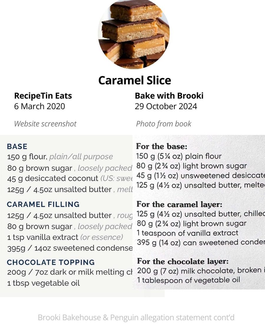 In November 2024, a reader emailed to say that she noticed “remarkable similarities” between my Caramel Slice recipe and the version in the newly released Bake With Brooki, a cookbook by Brooke Bellamy, an Australian social media influencer with almost 4 million followers who has a cookie shop in Queensland.