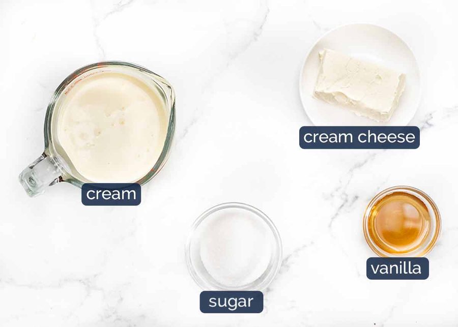 • Whipped cream – Put the cream cheese, vanilla and sugar in a bowl. Beat with an electric beater on high for 1 minute until soft and creamy. Add cream and peat until firm peaks form. (If using stand mixer, use whisk attachment).