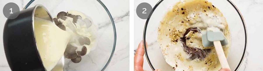 1. Melt chocolate – Heat the cream until just before boiling so it’s hot, but do not let it boil – that’s too hot and may make the chocolate seize. You just want to make it steamy-hot. Do it in a saucepan on the stove or in the microwave. Then pour it over the chocolate and give the bowl a shake to ensure all the chocolate is submerged.