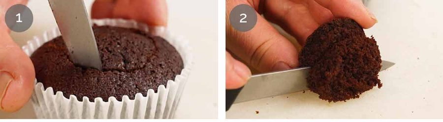 2. Trim excess off the cake you scooped out to leave a ~1cm/0.4″ thick lid. Make sure you keep the lids and cupcakes together so they fit properly – unless you are a baking genius who cuts lids exactly the same size for every single cupcake (not me, that’s for sure!!)