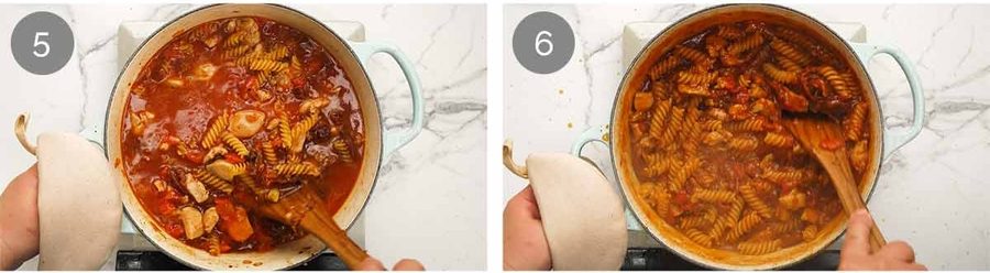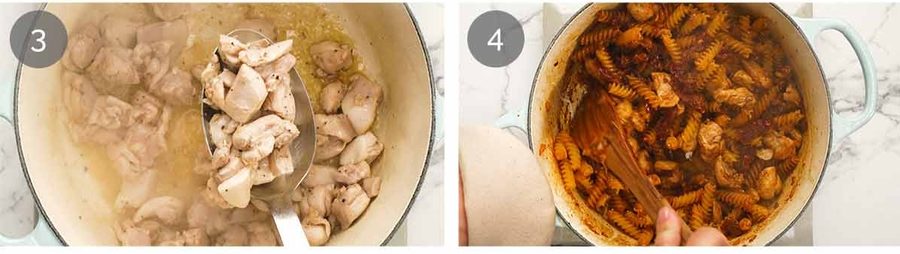 • Cooking liquid – Add pasta and cooked chicken along with any juices accumulated in the bowl. Stir to coat in all the tasty flavours. Add the stock, canned tomato, salt and pepper.