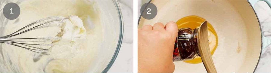 1. Make whipped ricotta – Just mix the ricotta, parmesan and milk together using a hand whisk. At first, it will seem lumpy and thoroughly unimpressive, but after about 10 seconds of vigorous whisking it will loosen and transform into a soft creamy mixture almost like softly whipped cream. Adjustment note: Different brands of ricotta have different consistencies, so add a touch of extra milk if needed.