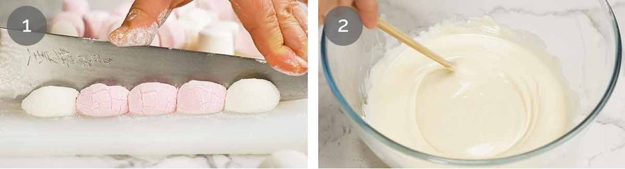 Cut most of the marshmallows in half (~ 2/3). I use a knife as I do multiple in one go, but I know most people instinctively reach for scissors.