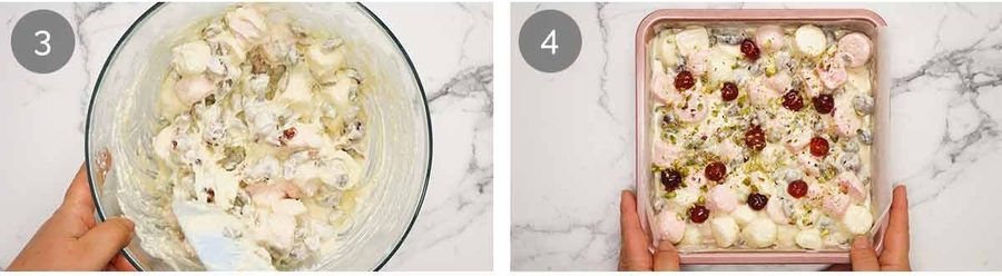 Reserve toppings – Set aside 8 or so of the nicest glacé cherries. Finely chop 1 tablespoon of the pistachios.