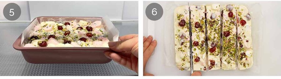 Here’s what I put into my White Christmas Rocky Road. My goal – festive colours! Red cherries, green pistachios, white chocolate, marshmallows and coconut (don’t skip this!). Feel free to switch it with what you like / have – you need 4 1/2 cups in total.