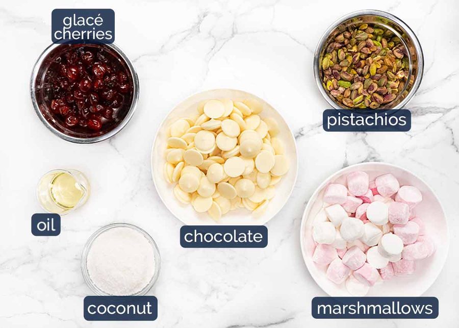 I’ve tinkered with a Christmassy-looking White Rocky Road for years but was never quite happy. The colours weren’t festive enough, the add-ins combo could’ve been better, and one year I even skipped the marshmallows (pink didn’t feel “festive”!) and overloaded it with nuts and fruit. It ended up tasting like a white chocolate Christmas cake. Not my finest moment!